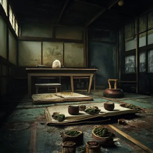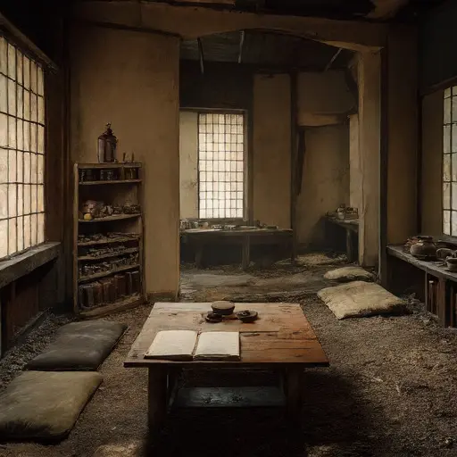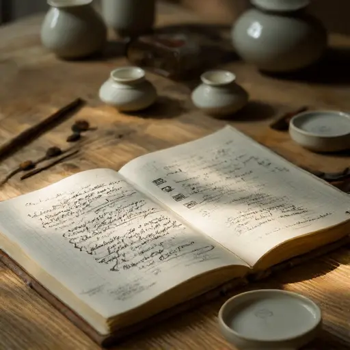 Bamboo whisks, porcelain cups, and cloths folded with care surround the table. The aroma ledger shows years of entries, each page documenting subtle differences between batches. A stone weight presses the ledger flat, its edges worn smooth from constant handling. The tools are not decorative; they are functional, designed to support precision. Dust now dulls their surfaces, but their arrangement still reflects practiced order.