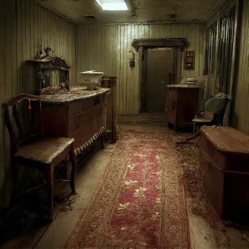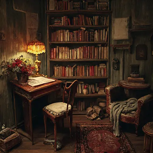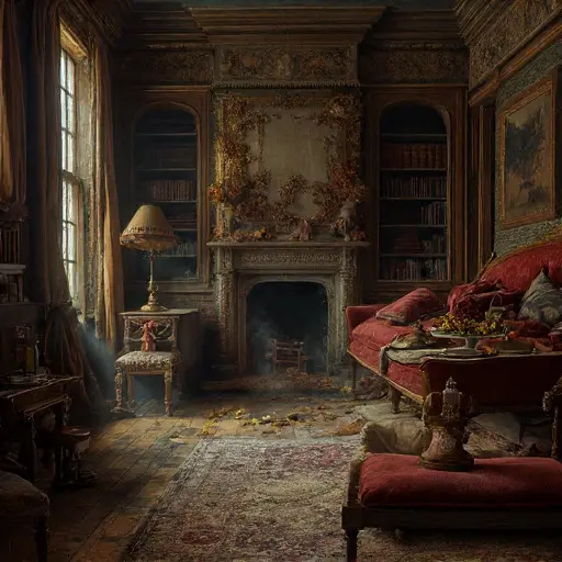 The parlour of Rimthallow Veridane House preserves the faint outline of a winter evening interrupted—dishes cooling, fabric waiting to be mended, a soft domestic pattern gradually unraveling into silence.