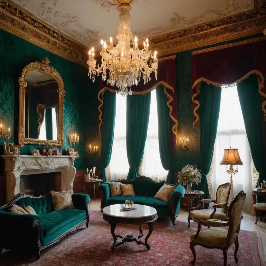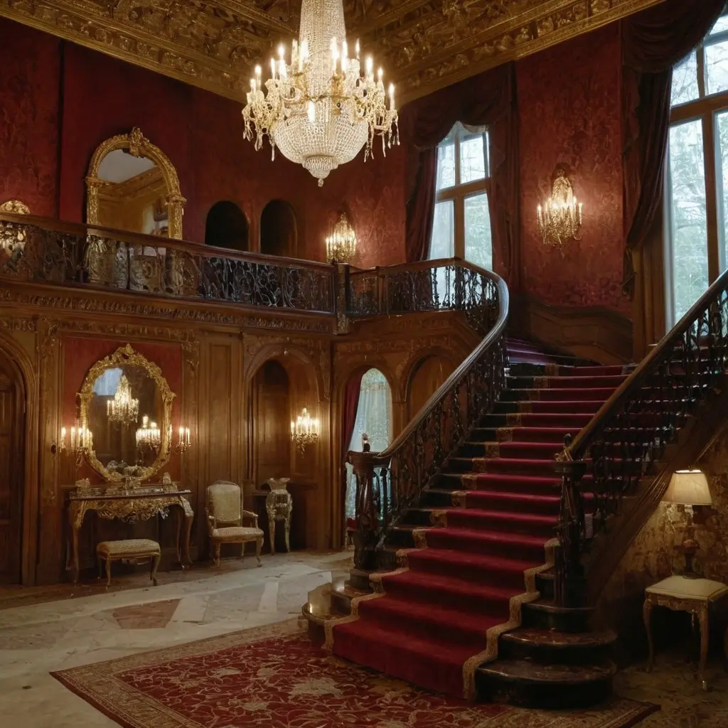 Entering Rosewood Hall is like stepping into a romantic painting brought to life. The parlor boasts high ceilings draped with ornate plasterwork, while the chandelier glows softly above a handwoven Persian rug. The furniture is an eclectic blend of mahogany and velvet, with every detail — from the embroidered cushions to the crystal decanters — exuding timeless class.