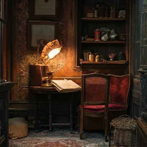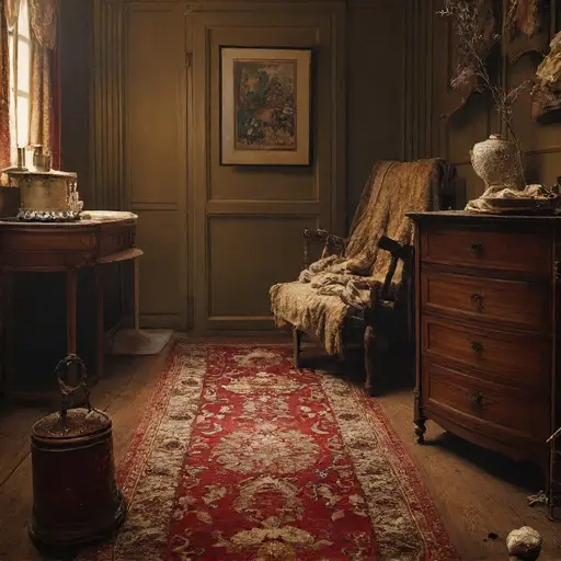 The parlour of Rossevault Cindermarre House feels shaped by habits that faded rather than stopped, as though evening routines were set aside briefly and never resumed. The air carries traces of cooled tea, wool worn thin, and ink left uncapped too long. Cushions still hold the softened hollows of those who once shaped the night hours here.