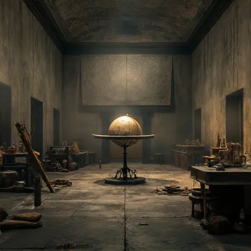 Cartographer Master Spatium Vacuum was last heard working in his studio, followed by a sudden, intense sound of heavy wood grinding and metal snapping (from the globe and the theodolite) and then immediate, profound silence. He did not leave the manor. The next morning, the studio was cold, the Datum Chamber sealed, and the man was gone. No body was found, and the only evidence was the singular, physical alteration to his final philosophical work.