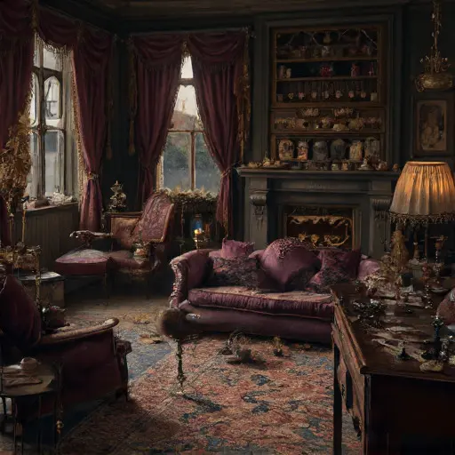 The parlour of Shadevale Orrinthyre House carries a hush that has thickened slowly, shaped by years of repetition rather than abrupt absence. A faint scent of cooled tea lingers under dust and wool. Upholstery caves inward where nightly patterns once pressed themselves into habit.