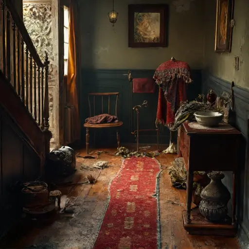 In the front passage, Marentha’s boots rest angled inward, their laces hardened like wire. Felward’s misaligned buckle-forms lie scattered near the wainscot. A cracked lamp chimney sits beside a dust cloth she dropped during an unfinished chore.