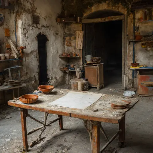 Quiet rumor said a commissioned tile panel—destined for a merchant’s storefront—showed uneven firing, its colors sinking into muddied tones. In the narrow passage, María’s mixing bowl pouch lies torn at the seam. A stack of test tiles has toppled, each bearing slight misalignment. A slip of firing notes rests beneath a cracked lantern, its final column overwritten. A brush handle has snapped near a puddle of dried slip, fragments radiating outward. None of this proves miscalculation, yet every detail leans toward an inward fracture he carried alone.