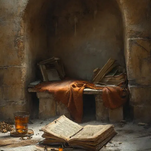 His evenings unfolded in gentle sequence: brewing anise tea, softening lamp smoke with a cloth, and marking metrical feet along parchment margins. His motions linger—quills arranged by firmness, pages weighted with a brass plate, correction marks drifting like small, deliberate breaths. Even the indentation on the floor cushion recalls the angle of his posture, listening for a cadence that might resolve his unease.