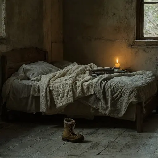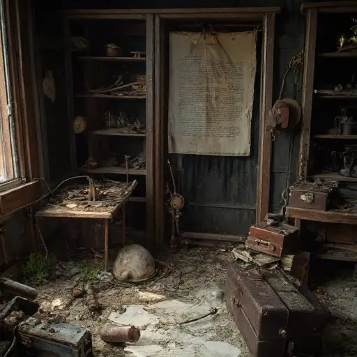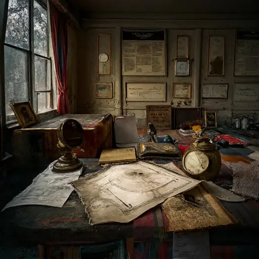 Quiet rumor suggested Ewan’s latest forecast predicted fair skies for a sheep-drive that met sudden rain, sparking unease among neighbors who had long trusted his steady habits. In the inner hallway, Morag’s hygrometer pouch lies torn near the banister. A rain gauge cylinder rests on its side, water dried to a faint ring. A recalculation sheet sits propped beneath a wall sconce, final markings overwritten in uneven strokes. A wisp of chart paper trails down a stair, its corner softened as if crushed in a hurried hand. None of these fragments confirm misreading, yet each leans toward a private doubt he kept tightly bound.