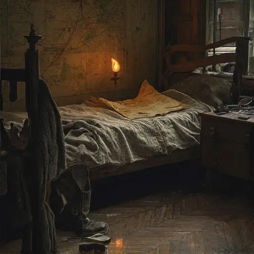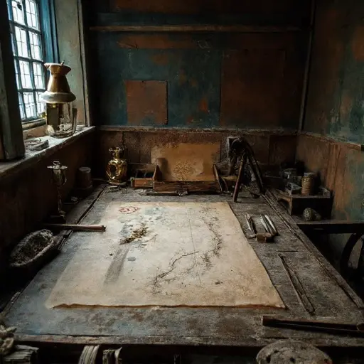 Quiet murmurs suggested that Cormac’s most recent commission—a delicate replotting of a known shoal path—revealed drift in several soundings, prompting private questions among those who trusted his steady work. In the interior corridor, Seamus’s spyglass pouch lies torn at the clasp. A coil of plotting twine has unravelled into wavering loops across the boards. A revision sheet rests beneath a narrow table, its updated bearings overwritten in tremulous strokes. A faint scatter of graphite dust marks one stair tread, as though shaken loose from a hurried grip. None of these hints prove miscalculation, yet each leans toward a private weight he kept contained behind calm, patient silence.
