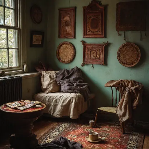 The hush threading through Harrington House seems to thicken in the loom-room, where the wool’s scent lingers in the rafters. Light from an oil lamp dims across half-woven cloth, its final inches softened by neglect. Here Mairi Eleanor Harrington once wove tartan orders that traveled far beyond these quiet boards, yet now only a stalled rhythm remains, poised on the warp like a forgotten breath.