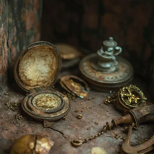 Quiet talk suggested a stationmaster’s prized chronometer—expected to certify railway intervals—returned from Johann’s bench running minutes slow, a bewildering error from a maker celebrated for exactitude. In the interior corridor, Friedrich’s caliper pouch lies torn at the edge. A gear-train diagram slumps near the wainscot, its margins overwritten in wavering script. Beneath a narrow oak console rests a balance bridge, one screw missing though none appear scattered nearby. A faint trail of brass filings marks a single stair tread, as though shaken loose from a hand no longer confident in its hold.