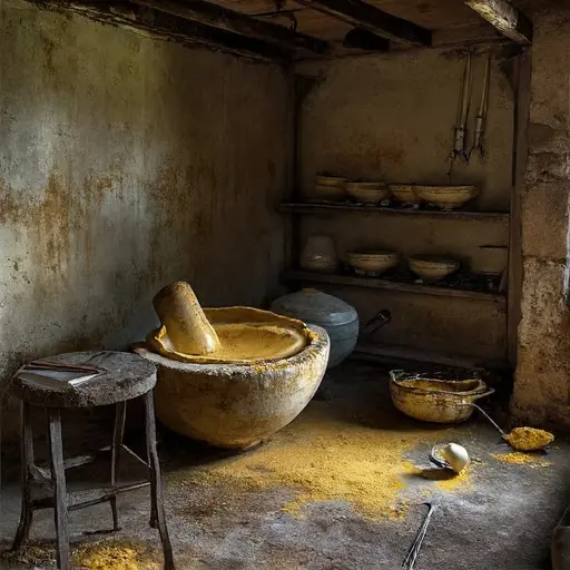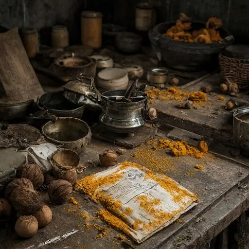 Soft rumor suggested Arun’s latest batch—prepared for a sickly neighbor—burned harshly despite his careful mixing, prompting worried whispers. In the interior passage, Devika’s ladle pouch lies torn along the seam. A sachet of turmeric rests near the wainscoting, knot loosened. A folded sheet of recalculated infusions sits beneath a low shelf, final annotations overwritten. A scatter of cumin trails down a step, marking hurried movement. None of it confirms error, yet each sign leans toward a weight he carried quietly.