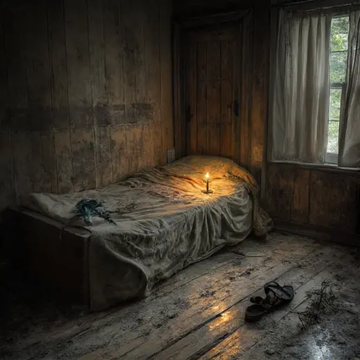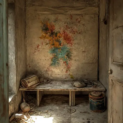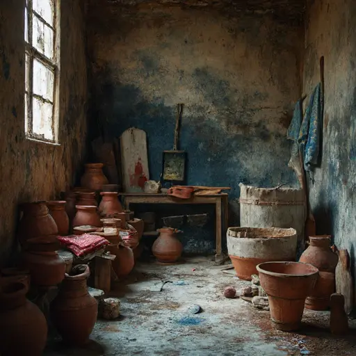 Whispers murmured that Adaeze’s latest cloth commission—intended for a wedding—developed blotches after washing, unsettling the family who ordered it. In the narrow hallway, Nkemdilim’s gourd-stamp pouch lies torn along its seam. A clay vat ring marks the wall where a pot once rested. A folded sheet of correction marks has fallen against the stair rail, last ratios smudged by hurried fingers. A spool of raffia has rolled toward the baseboard, trailing loops like hesitation set loose. None of it resolves the doubt, yet each sign leans toward a burden she carried alone.