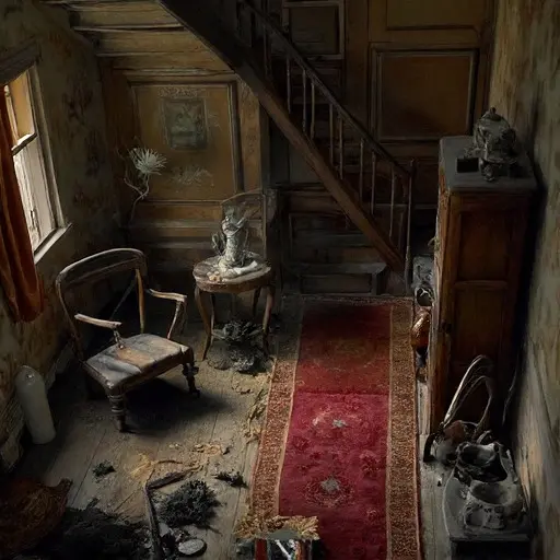 In the south corridor, Alderyn’s boots rest crooked against the wainscot, their laces stiffened from neglect. Leovar’s misaligned book-press plates lie near a cracked lamp chimney. A dust cloth she dropped mid-task remains exactly where it landed.