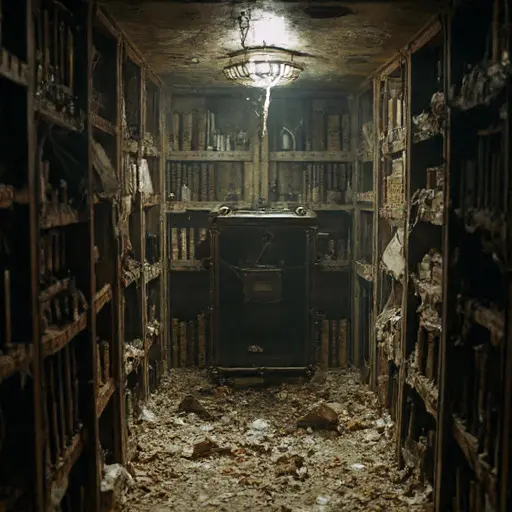 The house preserves her systematic anxiety structurally. Many internal passages are fitted with small, precisely calibrated light baffles and velvet curtains built into the hallways, now all tattered and dust-covered, remnants of her attempts to create a universal, absolutely lightless environment for her experiments.