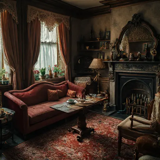 The parlour of Sylthmere Harravonne House feels shaped by long-worn routines that thinned into absence rather than broke abruptly. Faint traces of cooled tea, dried wool, and brittle ink linger above the softened furniture. Cushions hold the impressions of those who once shaped the evenings here, shadows of habits preserved only in the fabric.