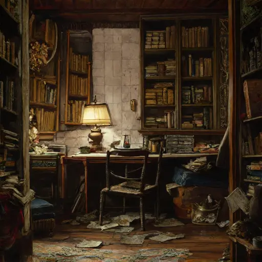 Maristelle Harravonne, tutor of household penwork and steady sums, lived here with her nephew Callen, a novice clasp-binder whose seasonal earnings waned each passing year. She tended the quillmark recess with even-handed discipline—slates graded by lesson, quills trimmed to near-identical points, blotters turned to expose clean corners. Before lessons she walked a slow preparatory loop, murmuring figures under her breath. But when Callen’s work faltered and winter stiffened her hands, the dependable structure of her teaching rhythm weakened. Papers waited uncorrected. Ink dried unevenly at the bottle’s rim. The recess began sinking softly out of order, mirroring the fatigue she never spoke aloud.