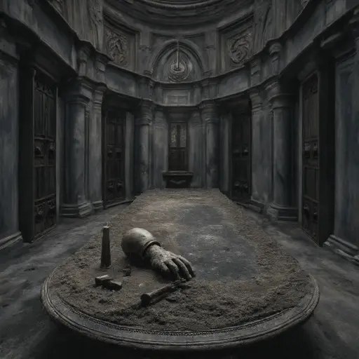 Tactile Master Sensus Vacuum was last heard working in his chamber, followed by a sudden, intense sound of heavy metal snapping and glass cracking (from the pressure gauge and the hand model) and then immediate, profound silence. He did not leave the manor. The next morning, the chamber was cold, the Perception Chamber sealed, and the man was gone. No body was found, and the only evidence was the singular, physical alteration to his final philosophical work.