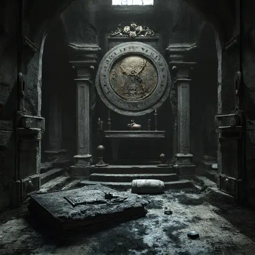 Chronologist Master Aevum Vacuum was last heard working in his laboratory, followed by a sudden, intense sound of heavy metal grinding and snapping (from the clock mechanism and the astronomical regulator) and then immediate, profound silence. He did not leave the manor. The next morning, the laboratory was cold, the Datum Chamber sealed, and the man was gone. No body was found, and the only evidence was the singular, physical alteration to his final philosophical work.