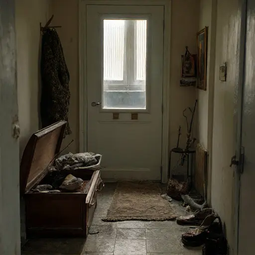 The Ionescu flat, valued at $142,000, holds quiet evidence of carefully guarded savings hidden in an abandoned entryway bench. Dust coats the tiled floor and the bench lid remains slightly open, as though it had been used one last time and then forgotten.