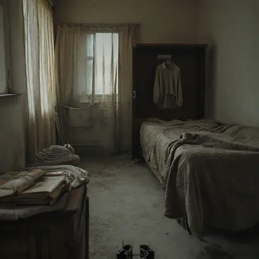 Eight clues remain scattered around the hall. A stitched badge on the jacket reads Hassan Ibrahim. A folded driver permit lists his birth year as 1980 and place of birth Alexandria. A small notebook tucked beneath the bench records daily totals of wages. Bus tickets spill from a pocket of the jacket. A thermos with dried tea stains sits beside the shoe rack. A photo clipped to the mirror shows two children smiling. A bundle of route maps lies folded beneath the basket. Finally, several envelopes marked with dates hold carefully saved notes.