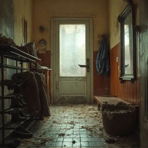 The entry hall still holds the jacket and the shoe rack exactly as they were left.
