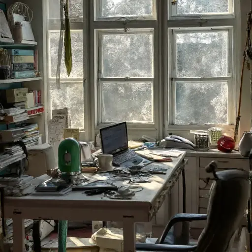 His presence lingers in scattered notebooks, a digital tablet left charging, a headset draped over the chair, a stack of printed contracts, and a sleek briefcase pushed under the desk. Daily routines—client calls, coding sprints, and financial reviews—are readable in the frozen monitor, sticky coffee stains, and penciled notes indicating valuations. Temperament appears fastidious yet absorbed in work, leaving traces rather than people.
