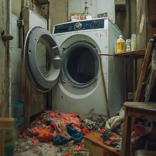 The Ravenwood apartment, valued around $261,000, holds its remaining trace inside a laundry nook that has long stopped functioning. Beneath soaked fabrics and overturned supplies, a waterproof notebook marked ledger remains hidden where it was last placed.