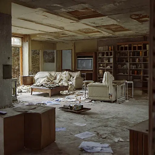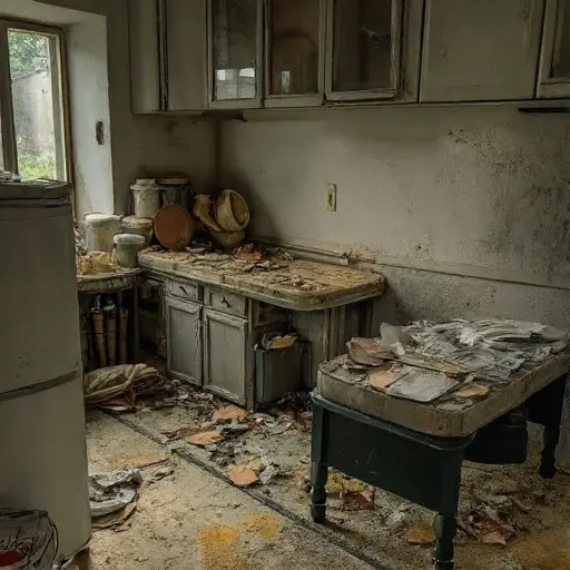 The apartment stands silent and deteriorating, its cleaning space frozen in abandonment, with the concealed ledger left exactly where it was last recorded.