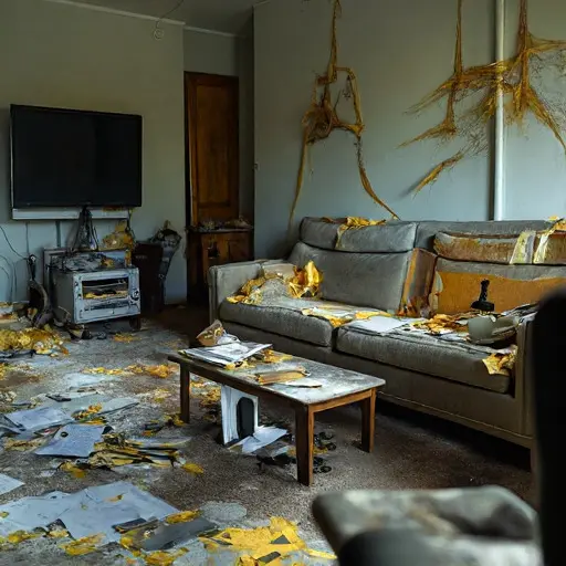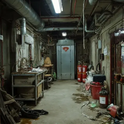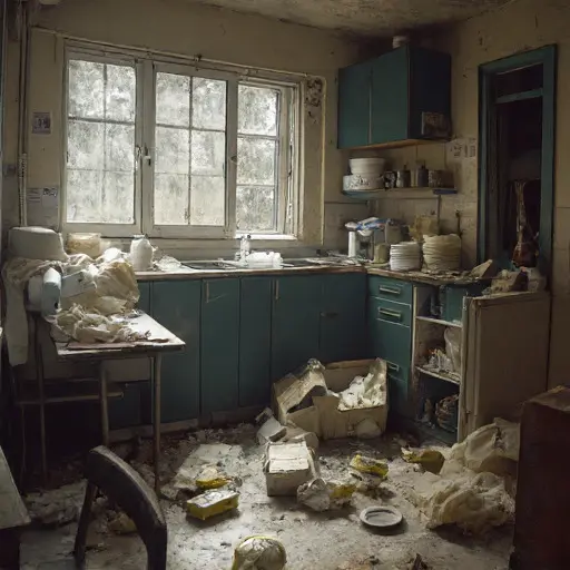 The apartment stands silent and deteriorating, its service passage frozen in abandonment, with the concealed capital left exactly where it was last locked away.