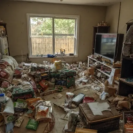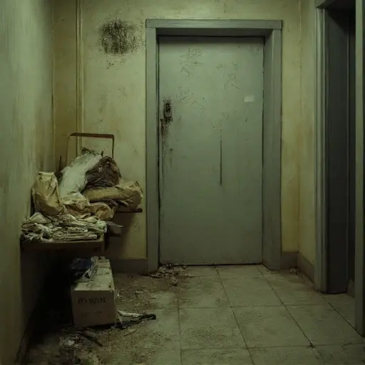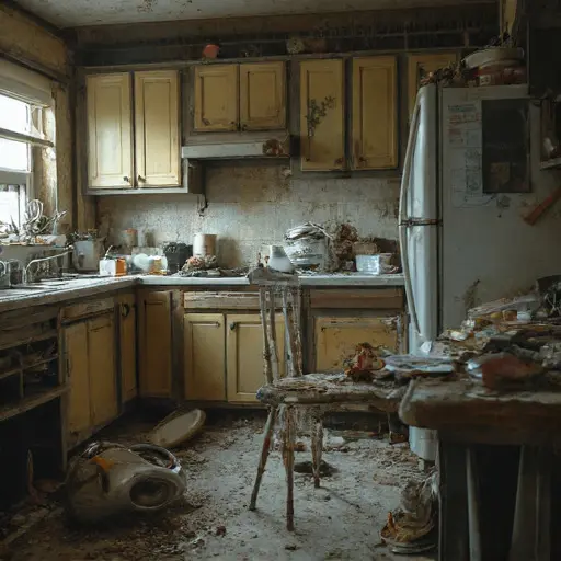 The apartment stands silent and deteriorating, its transitional space filled with abandoned clutter, and the forgotten payout left where it was last counted.