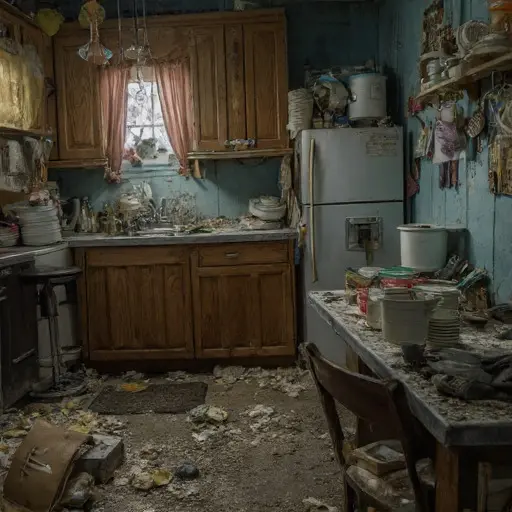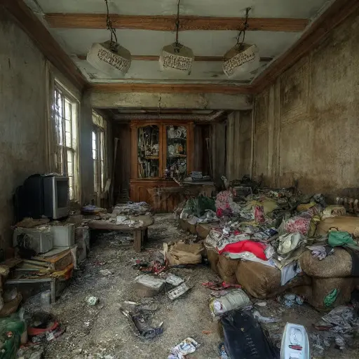 The flat stands silent and deteriorating, its hidden spaces filled with abandoned clutter, and the rare fees left where they were last counted.