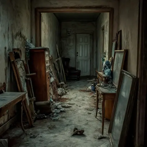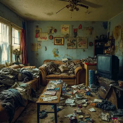 The flat stands silent and deteriorating, its spaces filled with abandoned clutter, and the silent budget left unresolved where it was last recorded.