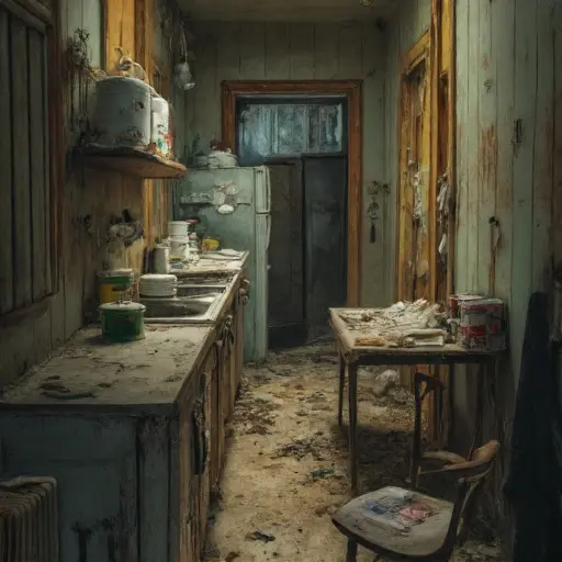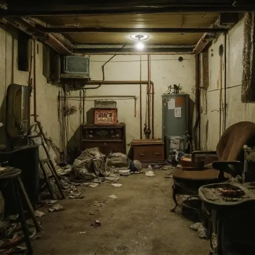 The flat stands quiet and deteriorating, its basement filled with abandoned clutter, and the rare cash left where it was last counted.