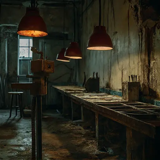 Seven traces define him: a glass plate resting half-submerged in a dried developer tray; a ledger marked “incomplete exposures”; a drawer of undeveloped negatives never processed; correspondence requesting urgent portrait deliveries; a cracked lens cap left beside the camera; a stack of photographic plates left without prints; and a recurring margin note—to reveal after full chemical stabilization.