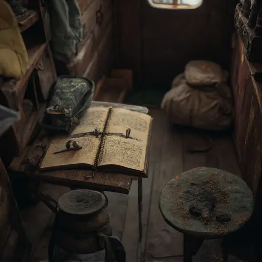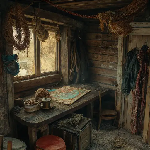 Seven traces define him: a coiled rope left half-knotted on the table; a ledger marked “incomplete catches”; a drawer of bait hooks never used; correspondence noting unusual shifts in fish movement; a cracked tide gauge used for shoreline readings; a stack of net repair patches left unfinished; and a recurring margin note—to confirm after next full return to shore.