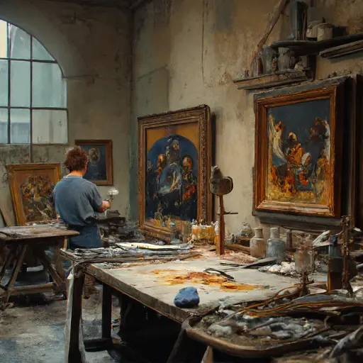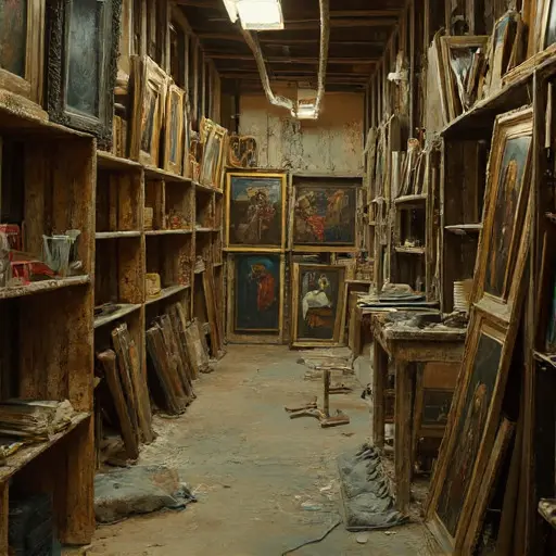 The word restorations appears across conservation logs laid open on the main workbench, each entry documenting damaged paintings brought in from churches, estates, and private collections. Early records are meticulous—pigment analysis, varnish removal stages, and careful retouching notes. Later entries become uncertain—unfinished layers, unstable solvents, and entire works marked “awaiting final stabilization.