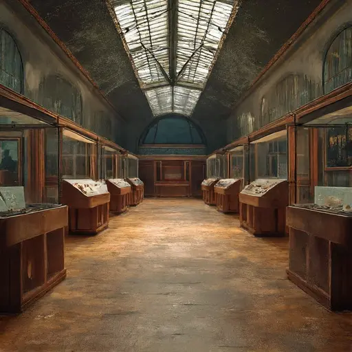 The word exhibitions appears across the planning documents spread over the curator’s desk, each sheet detailing curated collections, loan agreements, and thematic displays prepared for successive museum seasons. Early plans are structured and confident—object placements, lighting schemes, and guided routes carefully mapped. Later pages unravel—missing artifact confirmations, incomplete room layouts, and entire galleries marked “pending final arrangement.