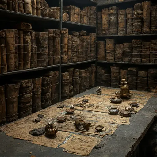 Seven traces define him: a brass counting frame frozen mid-slide with beads misaligned; a ledger marked “unconfirmed exchange settlement”; a drawer of currency seals hardened with ink residue; correspondence requesting validation from distant treasuries; a cracked glass weight used for coin calibration; a stack of exchange slips never finalized; and a recurring marginal phrase—account reconciliation pending currency standard alignment.