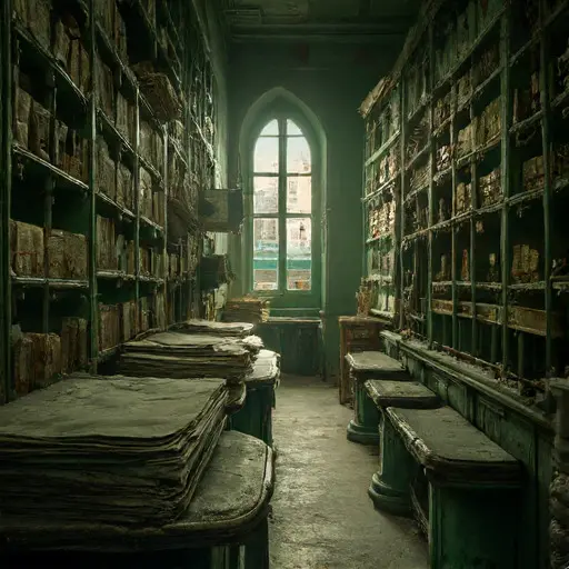 Seven traces define him: a brass key still inserted in a locked cash drawer; a ledger marked “unverified deposit reconciliation”; a stack of stamped savings certificates never dispatched; correspondence requesting confirmation from regional post inspectors; a cracked ink seal used for validating accounts; a pair of spectacles resting on a half-completed register page; and a recurring marginal phrase—deposit confirmation pending inter-office dispatch failure.