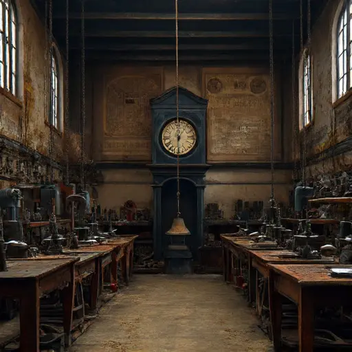 The word chimes appears across engineering sheets spread over the main assembly table, each page detailing the construction of municipal tower clocks and bell synchronization systems for town squares and railway stations. Early notes are exact—gear ratios, bell weights, and timed striking sequences carefully calculated. Later pages falter—misaligned strike intervals, missing bell calibrations, and entire tower systems marked “awaiting final acoustic adjustment.