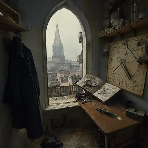 Seven traces define him: a pendulum left suspended mid-calibration; a ledger marked “incomplete chime sequences”; a drawer of bell tuning forks never matched to towers; correspondence requesting urgent completion of civic clock installations; a cracked regulator spring used for timing adjustments; a stack of tower face designs left without finalized hand alignment; and a recurring margin note—final synchronization pending full resonance test across all bells.