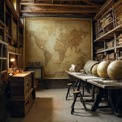 The word atlas appears across geographical survey books spread over the central drafting table, each page documenting continental mappings, expedition reports, and coastal surveys compiled from long-distance exploration routes. Early entries are exact—coordinates aligned, terrain elevations recorded, and trade routes carefully plotted. Later pages unravel—missing field data, conflicting coastline measurements, and entire regions marked “awaiting final expedition verification.