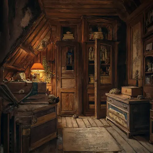 In the Sewing Room, Margaret’s final efforts remain poised as though awaiting her return. A half-mended apron rests beneath the treadle machine’s presser foot. Needles stiff with rust cluster in a pincushion hardened to the touch. Thread spools lie toppled across the table, their colors faded into ghost-soft pastels. Muslin folded for future garments has stiffened at the creases, edges lifting like paper.