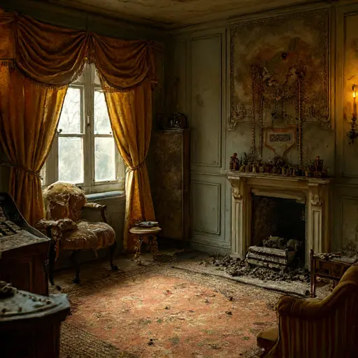 Upstairs, the corridor’s runner rug folds into softened ridges, its colors muted by dust. A hall table holds a broken spectacles frame, a snapped toy spring, and a personal note whose final sentence trails into nothing. Pale outlines show where toy sketches once hung before being removed with quiet resignation.