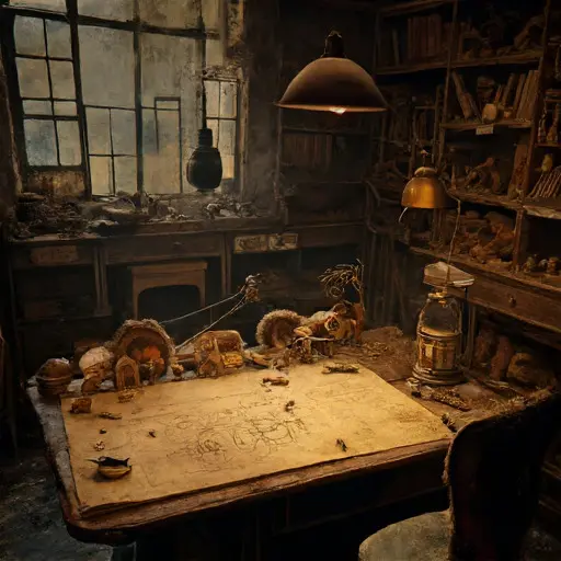 In the Toymaker’s Studio, wooden blanks sit stacked according to grain pattern, jars of tiny screws line a narrow shelf, and notebooks of design drafts lie in soft, buckled piles. Merial brought the warmth of care to the home—linens folded into perfect rectangles, mending stacked neatly, and recipe cards arranged in tidy rows. Olan’s presence remains everywhere: a half-finished wooden knight, chalk arithmetic on a small slate, a folded paper hat resting beneath toy gears.