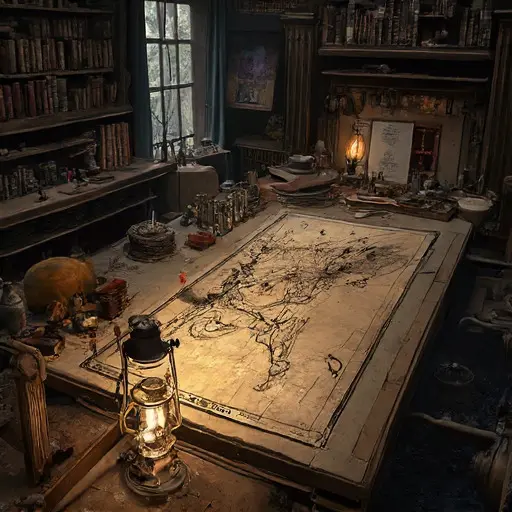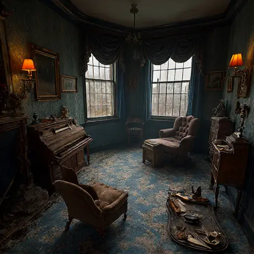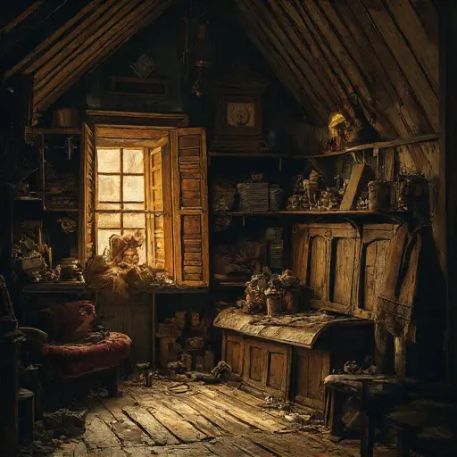Upstairs, the corridor seems to exhale resignation. The runner rug slumps in faded folds, its once-deep colors reduced to pale, dusty echoes. A hall table holds a cracked spectacles frame, a snapped feed prototype, and a personal note that ends without punctuation. Pale outlines on the wallpaper show where diagrams once hung before being taken down with quiet finality.