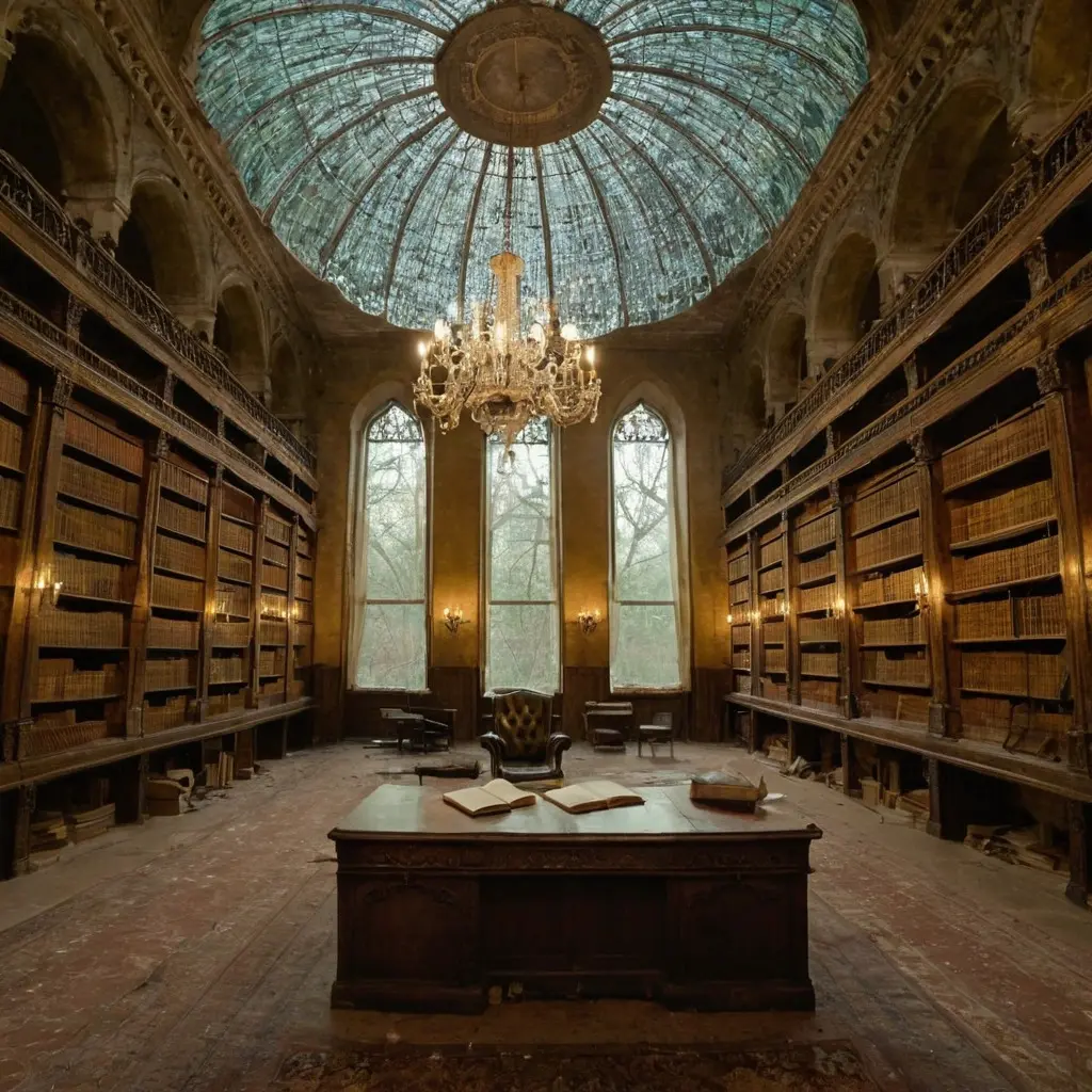 There’s something mesmerizing about how chaos and beauty coexist here—the spiral staircase, half-collapsed, still points toward the upper shelves, daring anyone to climb. Every book you touch seems to hum softly, as if remembering the hands that once held it. Some say the ink on a few pages still glows faintly in moonlight, forming words no one dares to read aloud.