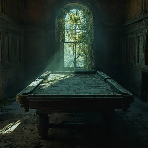 The Billiards Room, designed for evening entertainment and robust social interaction, is now steeped in an eerie stillness, its emptiness more profound than the sum of its decaying parts. Every remaining object stands as a silent witness to a life that ended in self-imposed, irreversible isolation and the cold stare of a terrible, final truth.