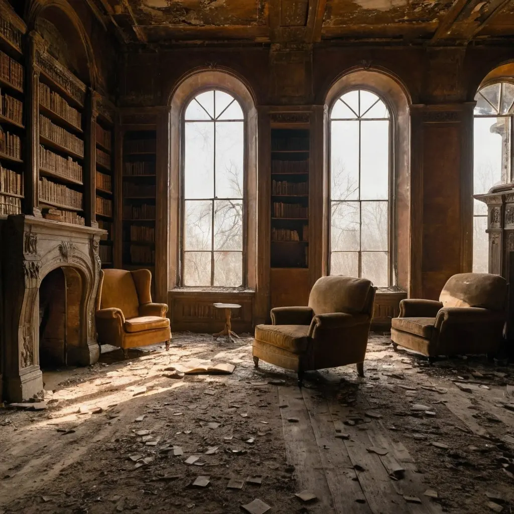 The library, once the pride of the house, now lies swallowed by silence. Books crumble in their shelves, their pages whispering in the slightest draft. The fireplace is cold, but ashes remain—a faint reminder of warmth that once was.