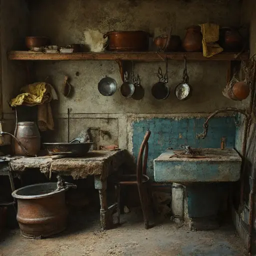The scullery stays abandoned, its basin dry, its measures fixed, holding the silence of a routine that ended without witness and never resumed.