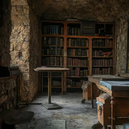 The Counting Room feels deliberately sealed, as though its last occupant expected to return before nightfall. The chalkboard dominates the space, numbers halted mid-column, totals never drawn. Ledgers lie open, corners weighted with rulers.